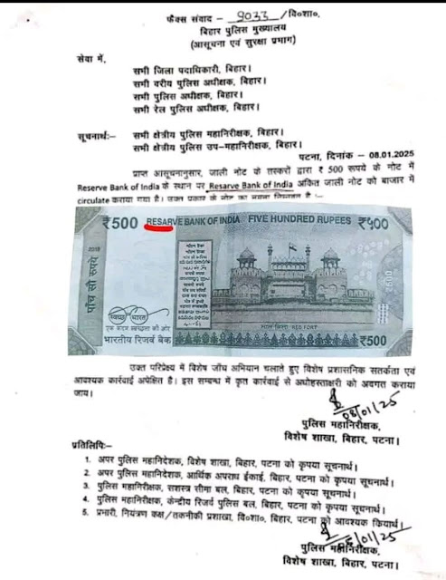 *₹500 के नकली नोट अब बाजार में दिखने लगें हैं, जिन्हें आम आदमी को पहचान पाना मुश्किल सा है। केवल अंग्रेजी में लिखे भारतीय रिज़र्व बैंक की वर्तनी (Spelling) में अंतर है, RESERVE BANK OF INDIA की जगह RESARVE BANK OF INDIA रिजर्व शब्द में S के बाद E के स्थान पर A है। कृपया 500 के नोट के लेन-देन में सावधान रहें।*